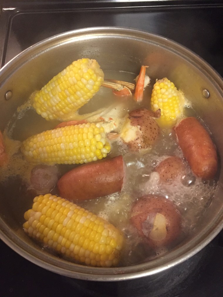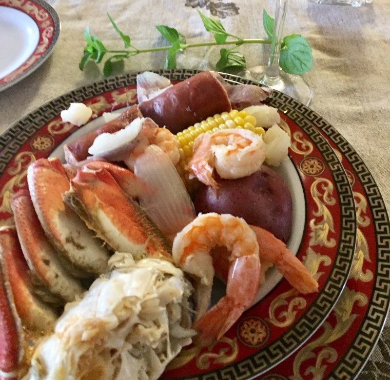 After I put the ingredients for the crab boil in the pot, I set the table and munched on an oyster or two. The question of table manners came up when my daughter ask where the claw cutters were to crack the crab.