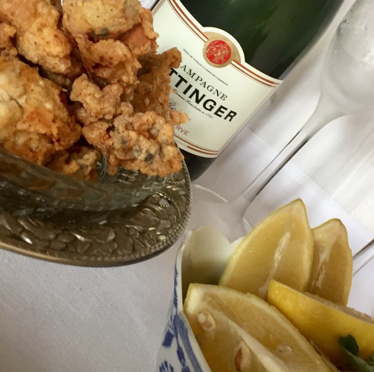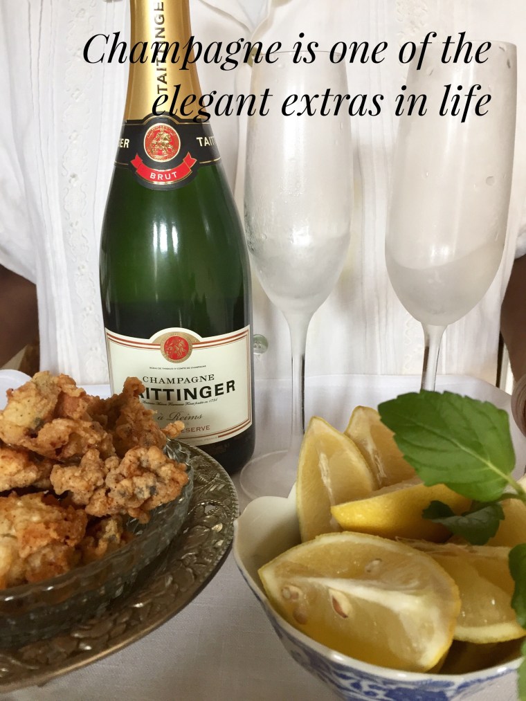 I explained that messy foods can be eaten with fingers at home or on the run, however they are eaten with fork and knife if part of a more formal meal. Since we were enjoying a family meal together I assured her she was safe and could navigate the soft crab. A few oysters later and two glasses of bubbly and the dinner was ready!