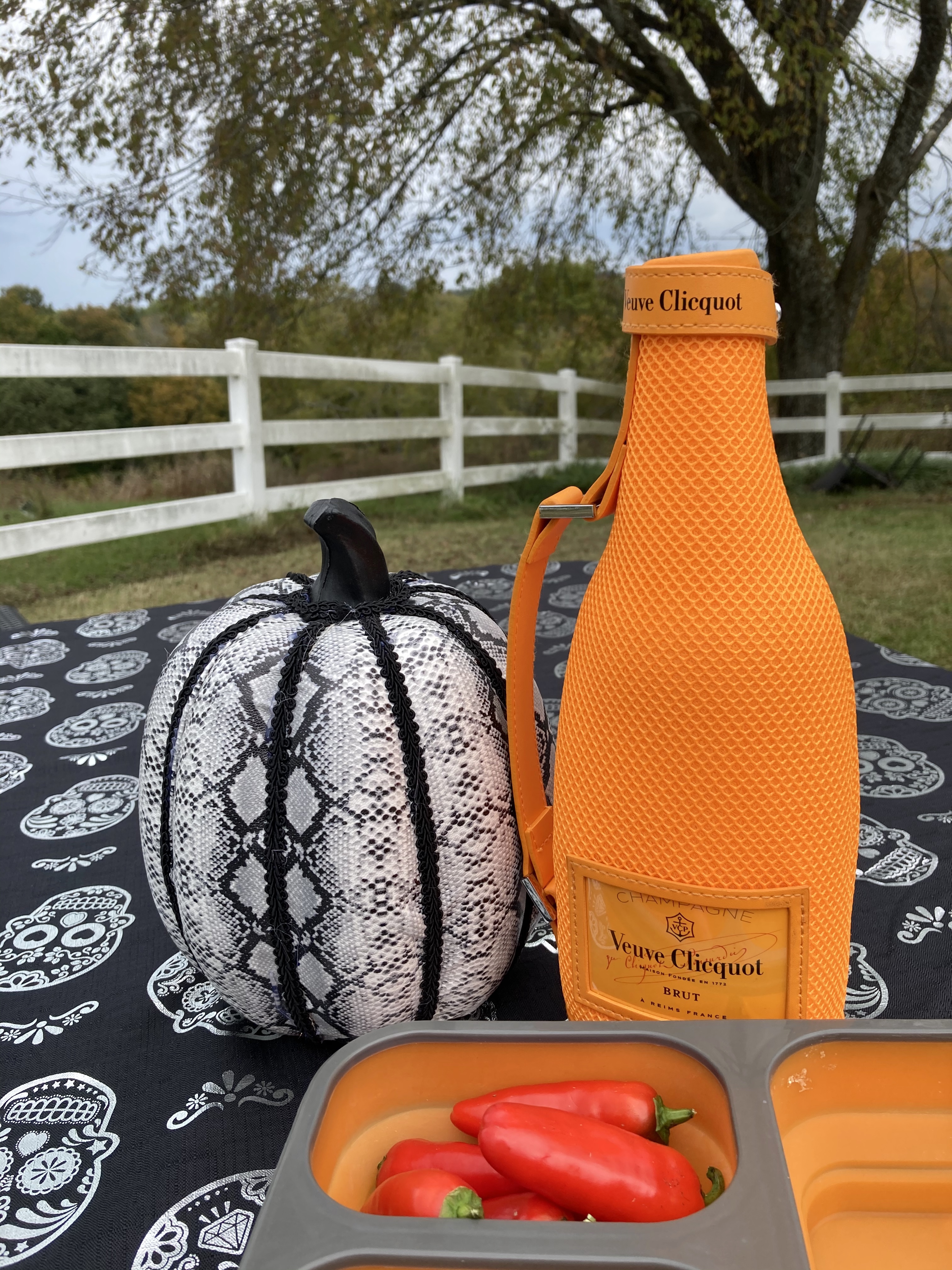 A designer pumpkin and a bottle of champagne make the season brighter!